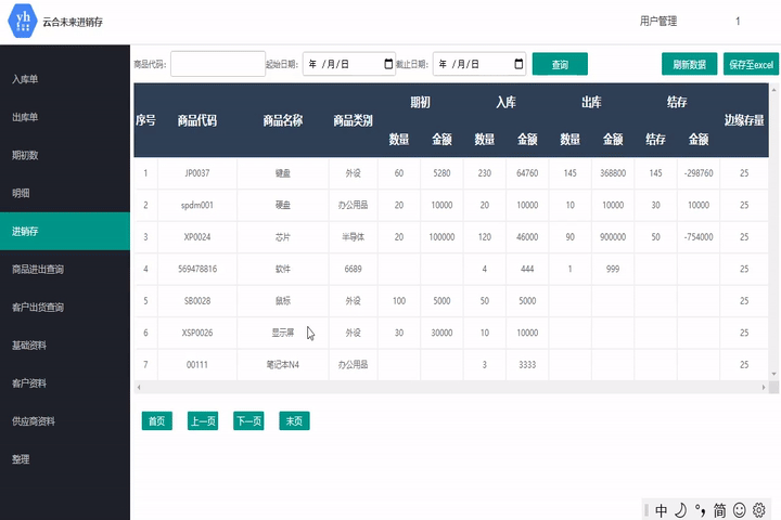 此模塊統計所有商品的期初、入庫、出庫,得出結存??砂凑丈唐坊蛉掌谶M行查詢